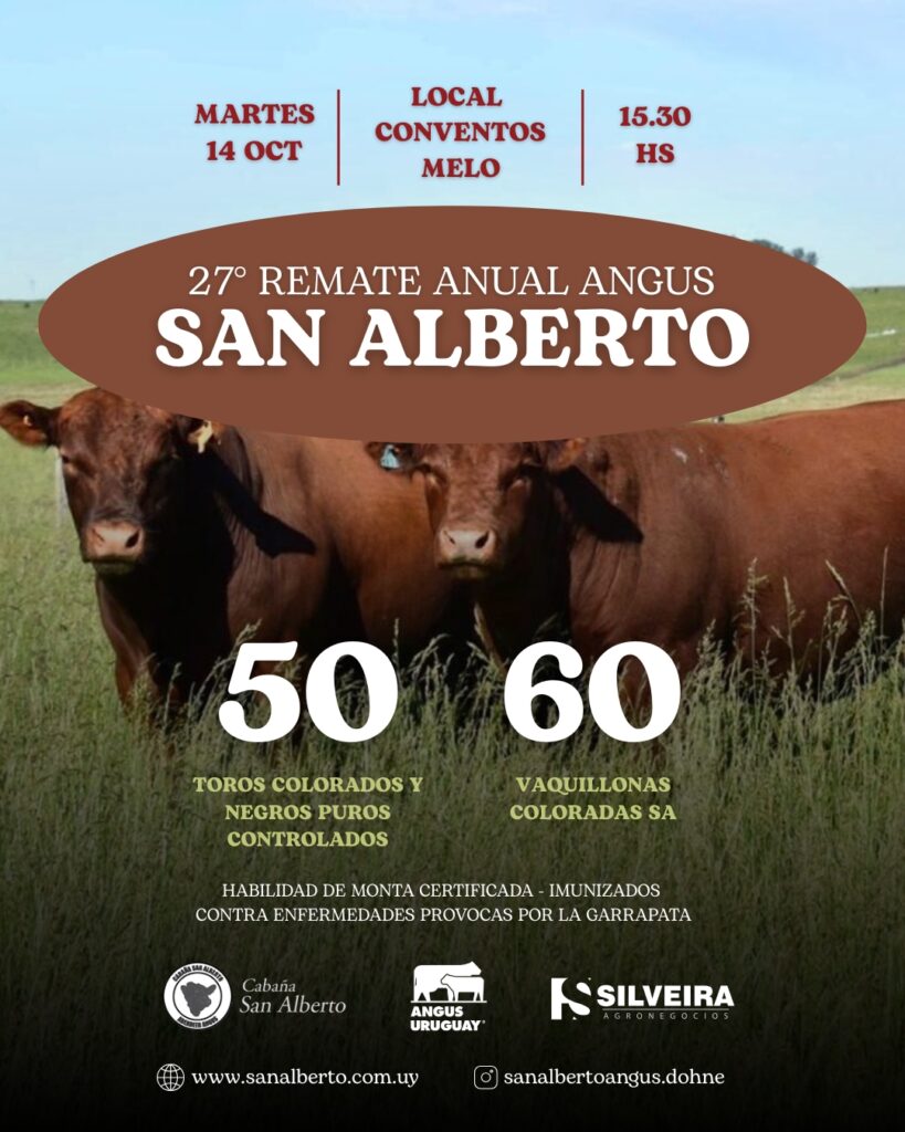 San Alberto SARL es una empresa familiar que se inició en el sector hace mas de 30 años. Actualmente desarrolla una explotación agropecuaria focalizada a la ganadería de ciclo completo tanto vacuno como ovino, y en la mejora genética contínua en las cabañas de Aberdeen Angus colorado y negro y de lanares Merino Dohne.